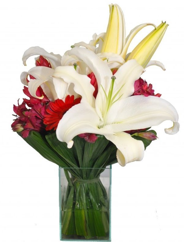 Arranjo médio com lírios brancos,astromérias, alpinias e gerberas, acabamento envolta de folhagem canoa, acompanha um lindo laço de cetim.