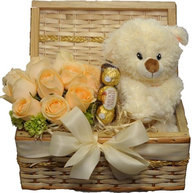Lindo baú de vime elaborado com um arranjo de 10 rosas chá acompanhado de um lindo urso de pelucia e 3 unidades do chocolate ferrero rocher,
