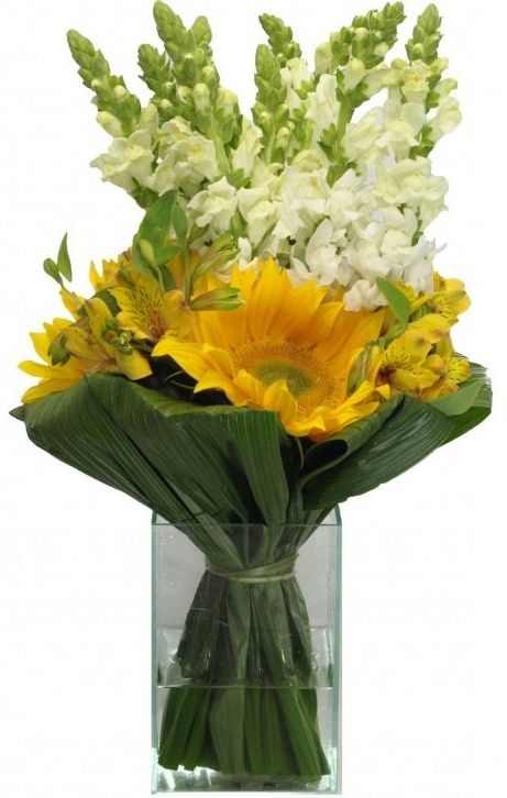 Lindo arranjo no estilo buquê feitos com maravilhosos girassóis e bocas de leão brancas acompanhando com um leve toque do delicada alstromérias, exuberante folhagem canoa, confeccionado na peça de vidro.