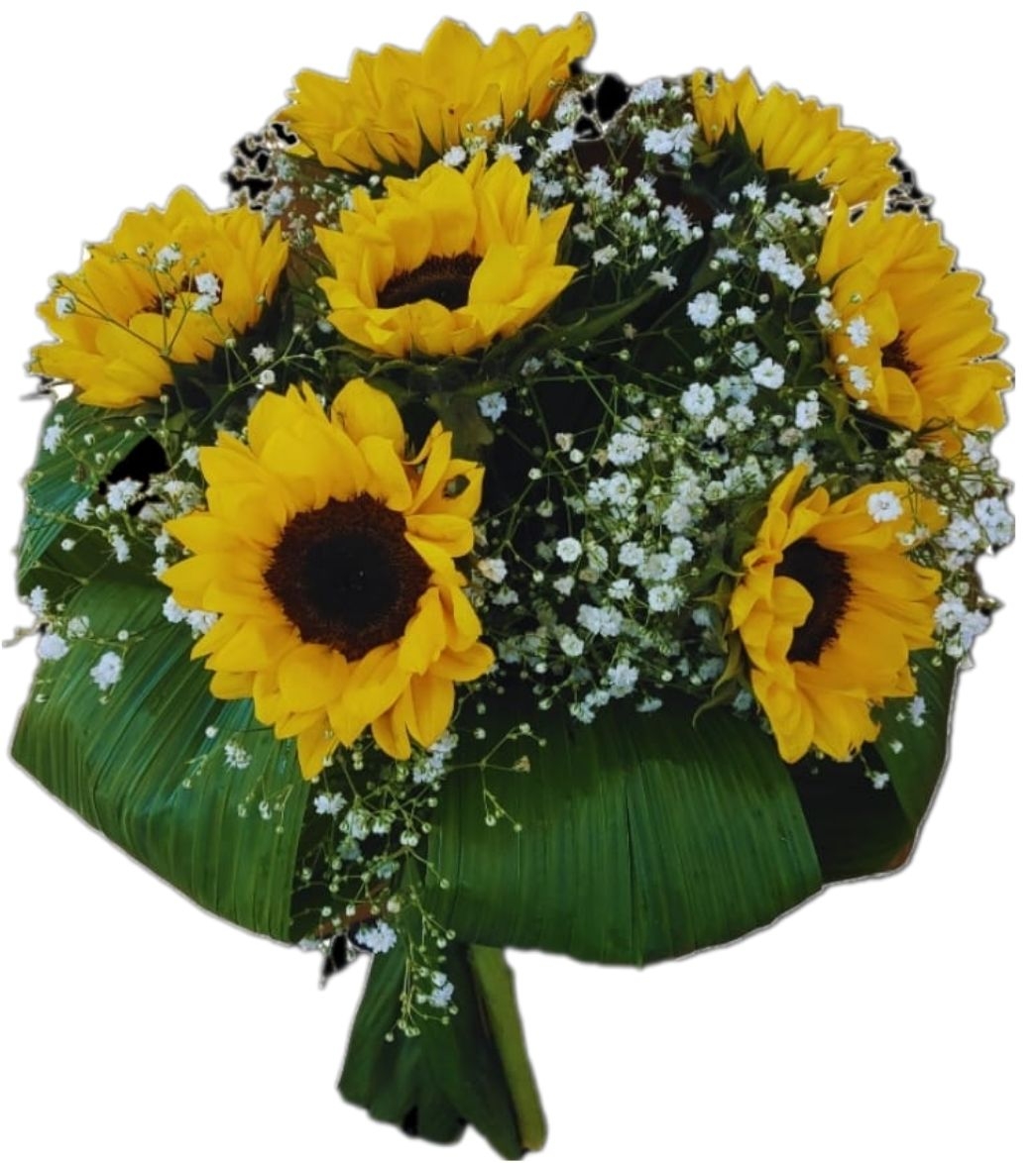 Buquê de Girassóis contendo 6 flores, chuva de Prata com acabamento de folhagem Canoa,