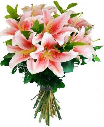 Lindo buquê elaborado com aproximadamente 12 flores de lírios e folhagens especiais,