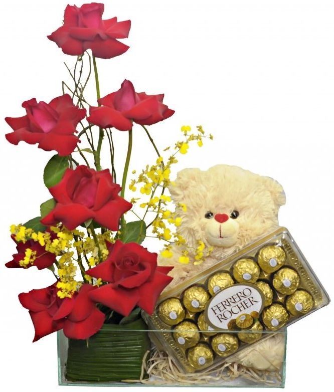 Lindo Arranjo Elaborado com 10 rosas vermelhas,um toque todo especial de orquídeas oncydium ou tango, acompanha uma linda pelúcia de 30 cm,e uma caixa de bombom ferrero rocher com 12 unidades,