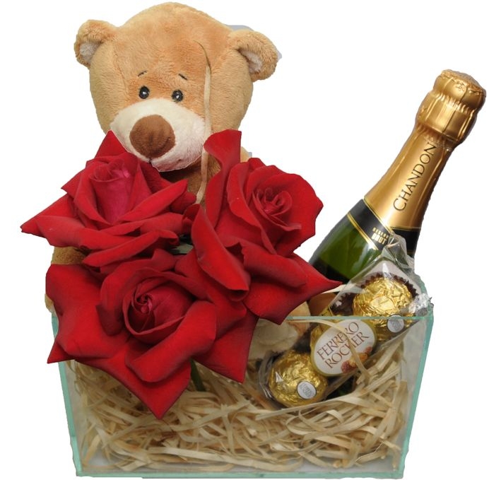 Lindo arranjo trabalhado com 3 rosas vermelhas de exportação, acompanhado de uma chandon baby uma linda pelúcia no formato de ursinho,e uma embalagem contendo 3 unidades do bombom ferrero rocher,