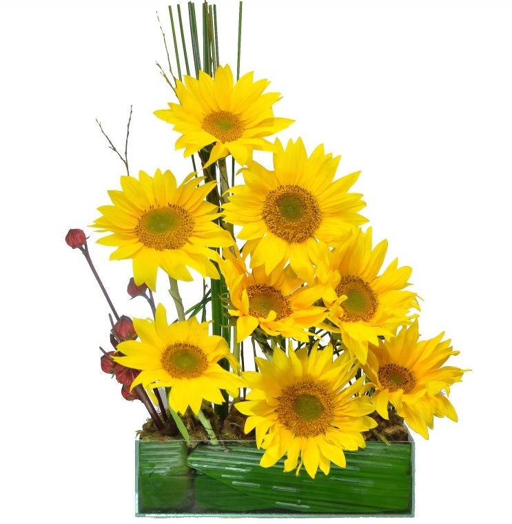Lindo arranjo de girassóis na jardineira de vidro com 9 flores. acabamento com folhagem especial,