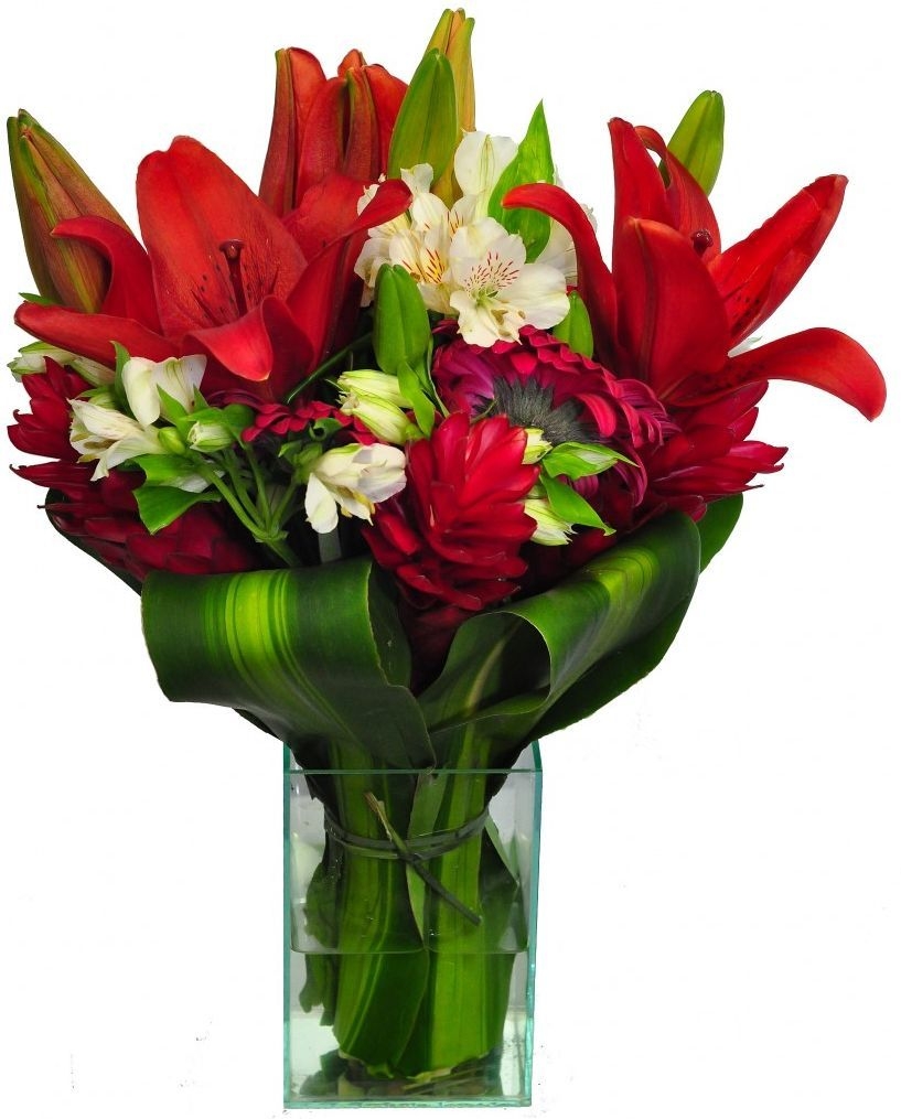 Arranjo elaborado com lírios Vermelhos ou em cores da época , alstromérias envolta acabamento de folhagem canoa no vidro,