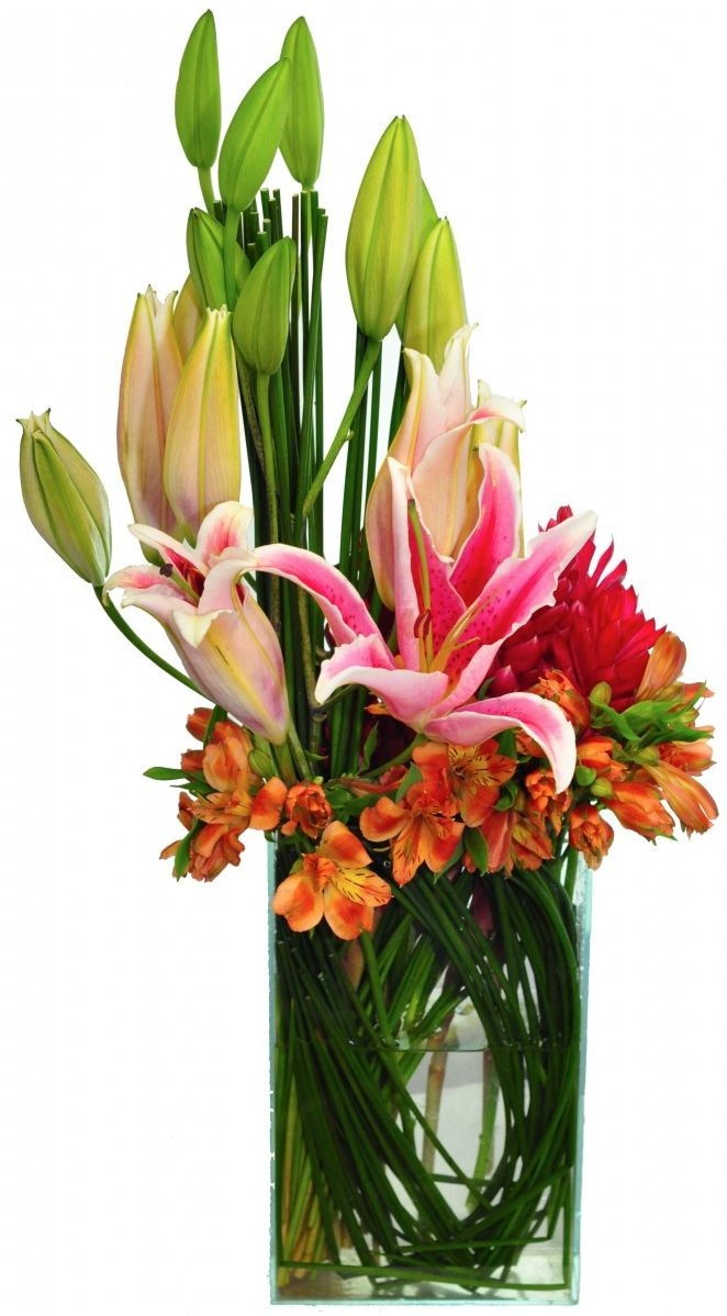Arranjo de lírios cor de rosa,junco e alstromérias trabalhado no vidro, acompanha um lindo laço de cetim ou tecido especial.