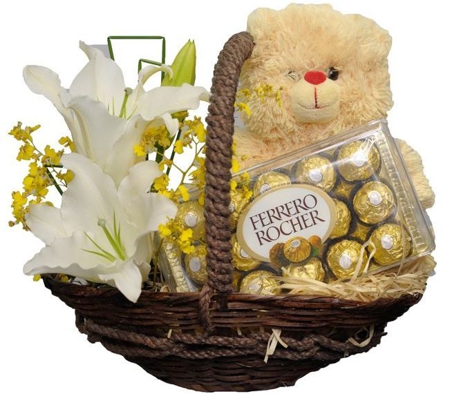 Linda cesta de vime preparada com lírios brancos ou em cores da época um toque todo especial de oncydium ou tango, para a cesta ficar ainda mais elegante sera acompanhado de uma caixa do bombom ferrero rocher com 15 unidades e para um complemento final adicionamos uma linda pelúcia de aproximadamente 25 Cm.